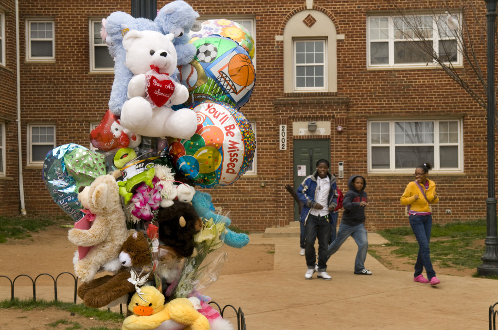 Shrine to Erica Peters, 36 and her children Eric, 11, and Dakota, 10, who were killed March 21st in their apartment in Northeast, Washington D.C. Photo by Lloyd Wolf.