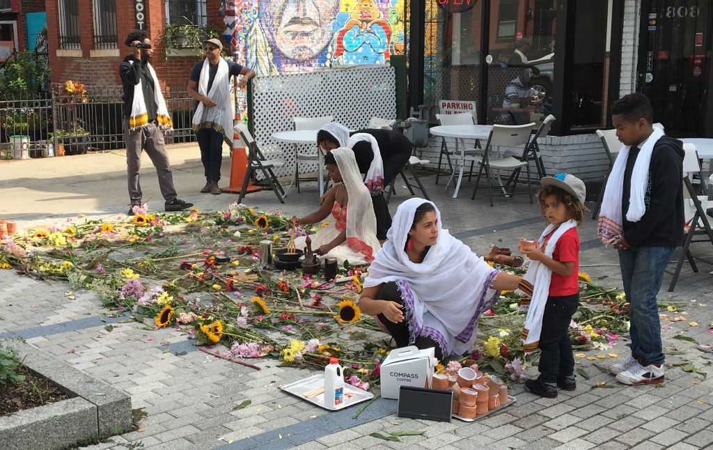 Tsedaye: The children at the Shaw community center that I’ve been working with for the last three years, they made the coffee ceramic cups that we used. They made about 100 in the last month leading up to the performance and I had some of those children involved in the performance. They’ve been working with me doing various forms of art and this summer in particular we’ve been doing placemaking performances in Shaw and this was part of that. On top of their involvement, I also had friends and artists that I gave tasks to, kind of slow gestures that were ritual based, like I had one person carrying the incense around and activating the space where I was serving the coffee and the audience as well. Someone else was sprinkling ground cinnamon, ground cloves, cardamom, all these spices that we use in Ethiopian food and tea and coffee. The children were the ones actually passing out the coffee and as they passed them out they asked the audience specific questions about what brought them to Shaw, if they live in Shaw, where do they live, why they love Shaw, how they feel about the changes happening in that part of D.C., and the whole point was to kind of start a conversation between the audience the neighbors and the children.