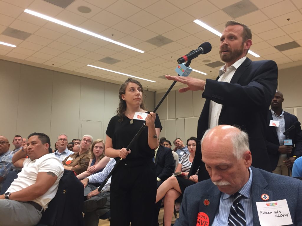 Josh Karrasch, the "gun dude," speaking at the Kojo In Your Community event on July 25.